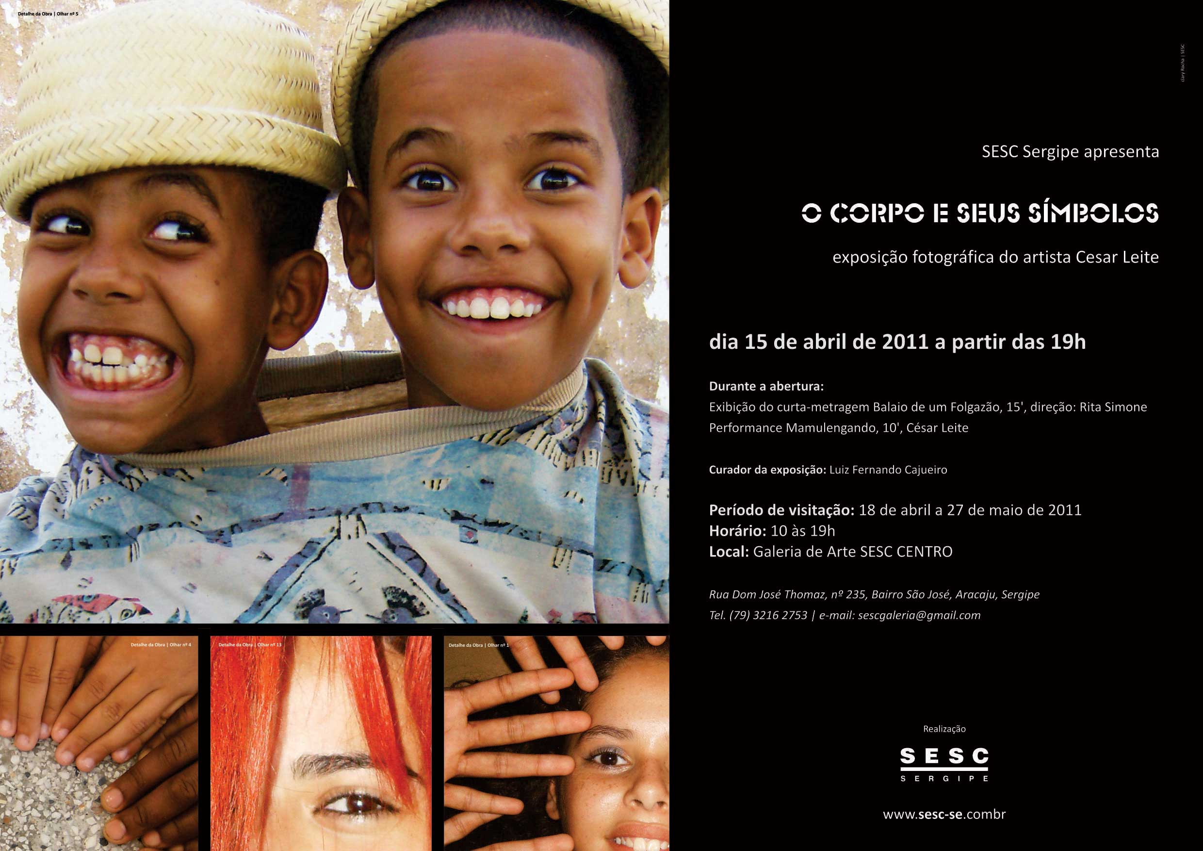 A Galeria de Arte do SESC Centro apresenta de 18/04 a 27/05, a Exposição Fotográfica “O Corpo e Seus Símbolos”, do artista Cesar Leite. A mostra traz uma visão particular do trabalho fotográfico do artista e professor sobre imagens corporais dos alunos da Escola Estadual Professor Acrísio Cruz, na cidade de Aracaju.